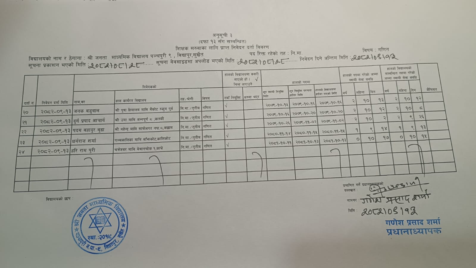 निम्नमाध्यमिक गणित शिक्षक सरुवाका लागि प्राप्त निवेदन विवरण प्रकाशन गरिएको सम्बन्धमा