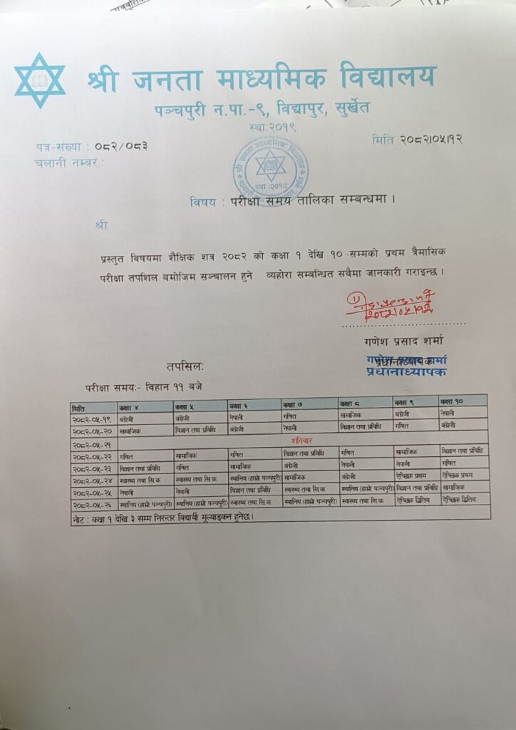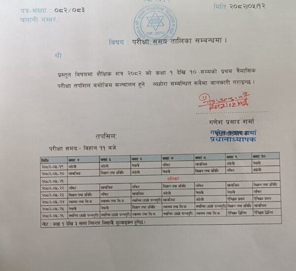 प्रथम त्रैमासिक परीक्षा २०८२को समयतालिका प्रकाशन सम्बन्धमा।